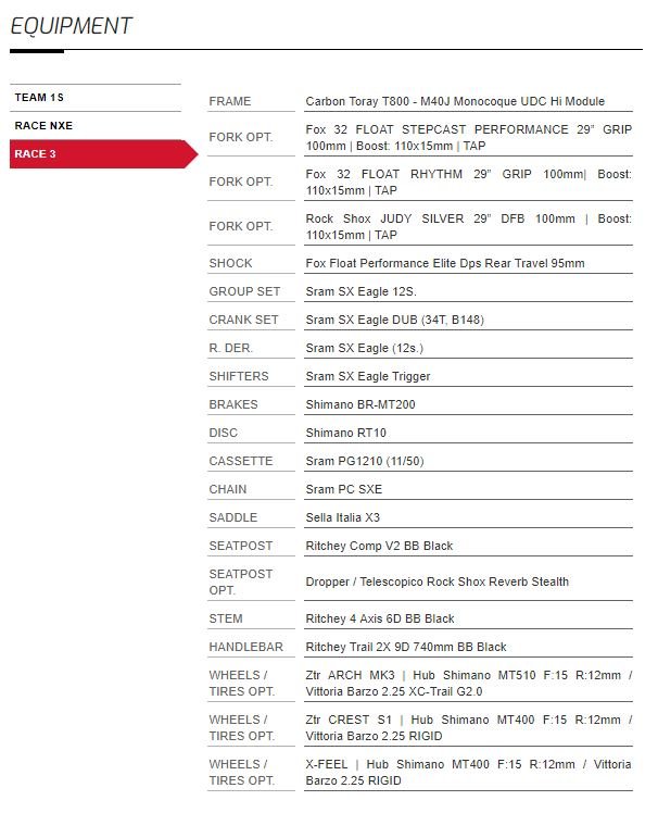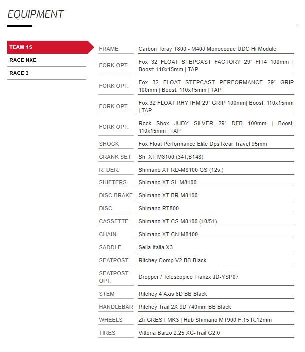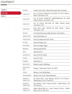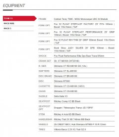 Leveres med Shimano- og Sramkomponenter, hjulsæt fra blandt andet Mavic og Miche og Rockshox og Racetrim affjedring.
